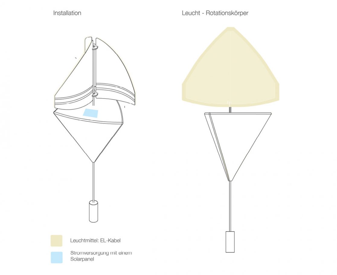 BRISE schwimmt, ähnlich einer Boje, rund um die Plattform im Wasser und schafft auf diese Weise eine Verbindung zum See. Am Tag wird sie als Windspiel wahrgenommen, in der Nacht dient sie als Leuchtelement. Die drei Segel, welche auf einem Schwimmkörper aus Kork angebracht sind, drehen sich im Wind und erzeugen somit ein Lichterlebnis. Um den Körper zum Leuchten zu bringen ist ein Solarpanel eingebaut. Lichtkabel an den Aussenkanten der Segel erzeugen in der Nacht leuchtende Rotationskörper, welche für eine aussergewöhnliche Atmosphäre auf der Plattform sorgen.