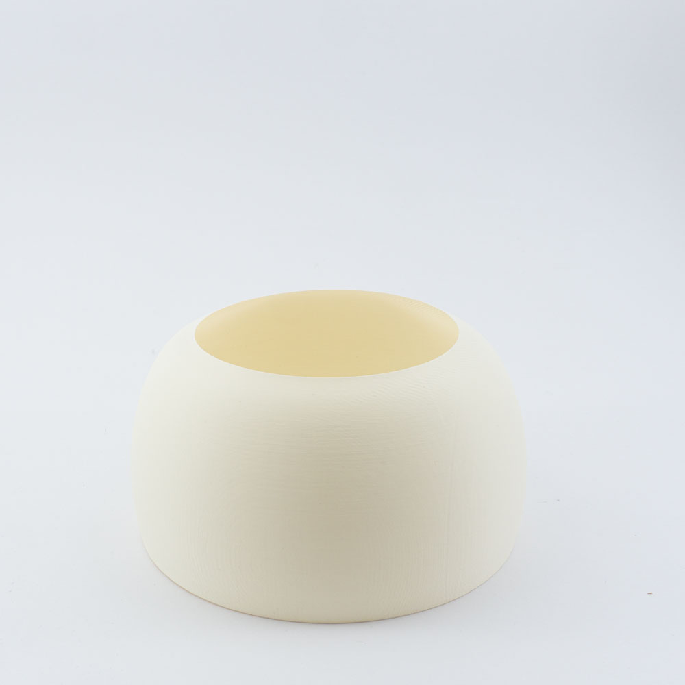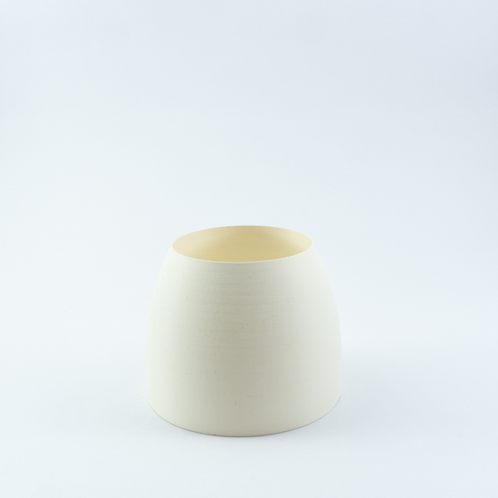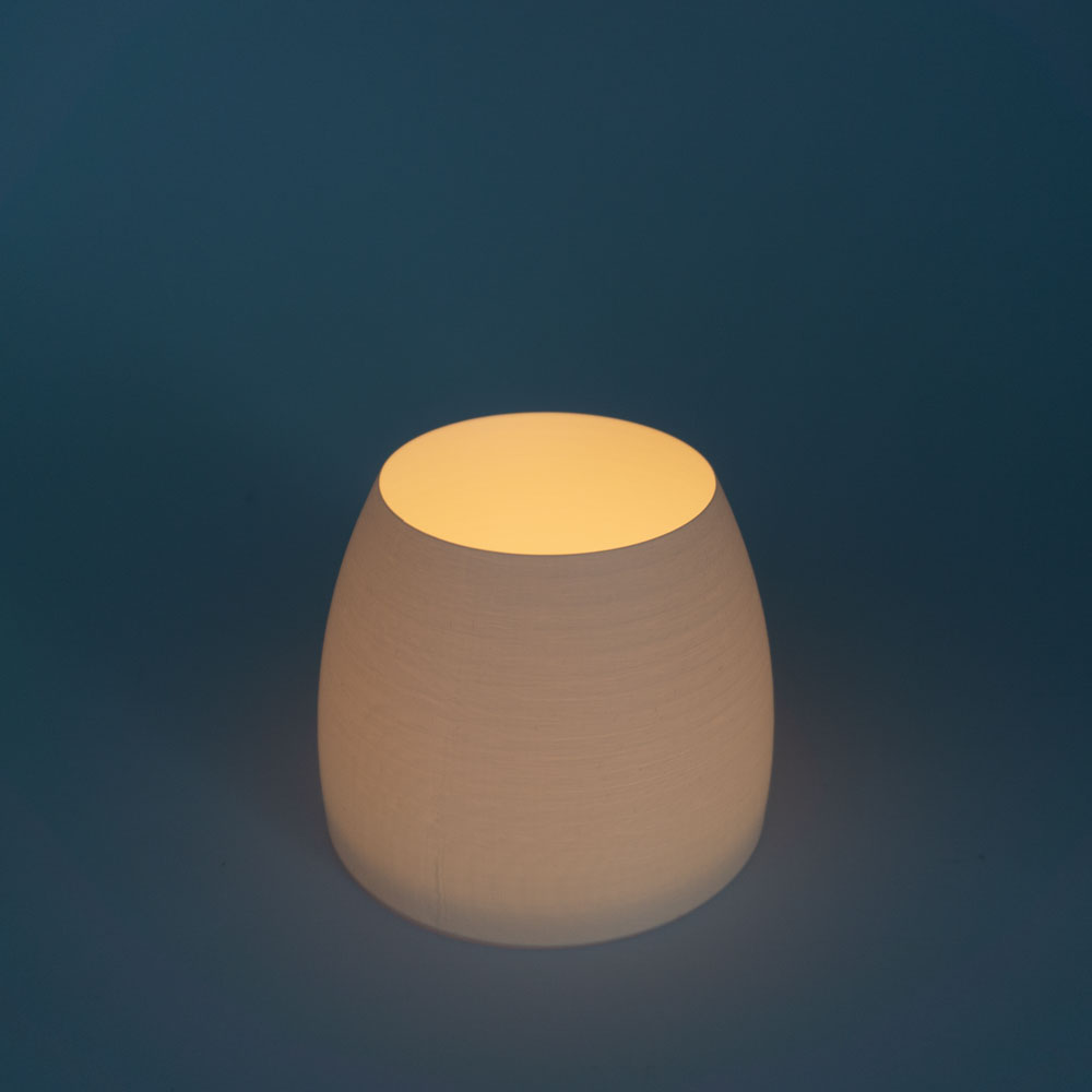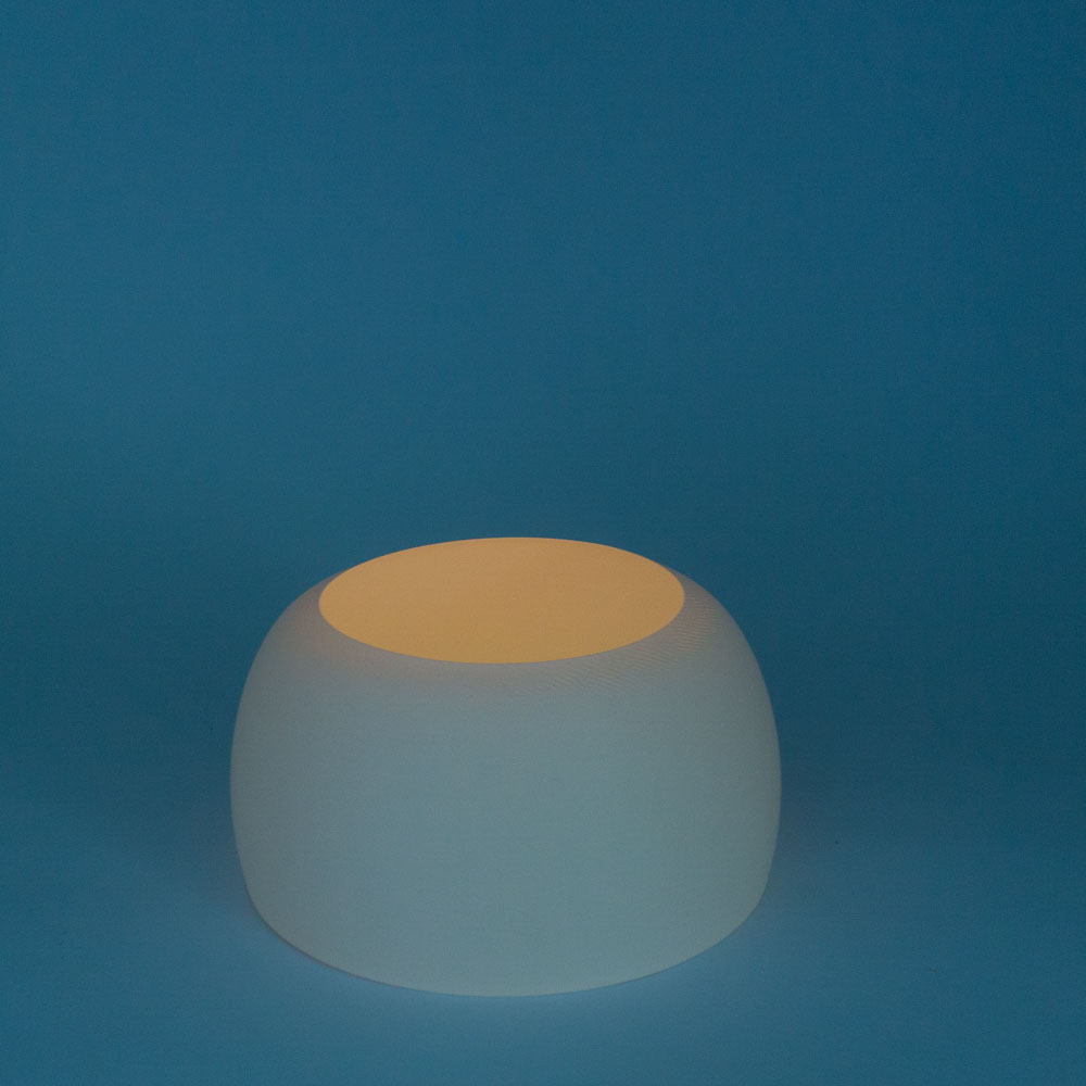 Ellipse ist ein minimalistisches Lichtobjekt das flackerndes Kerzenlicht in klare geometrische Formen verwandelt.  Die im 3D Druck produzierten Objekte haben eine sehr dünne Wandstärke, damit Licht durch den Körper scheinen kann. Die am Boden platzierte Kerze ist aus einem seitlichen Blickwinkel nicht sichtbar und die obere Öffnung ist so als homogen leuchtende Ellipse wahrnehmbar. Das unterschiedlich starke Licht von Wand und Öffnung schaffen einen poetischen leuchtenden Körper fürs Wohnzimmer oder für den Garten.
