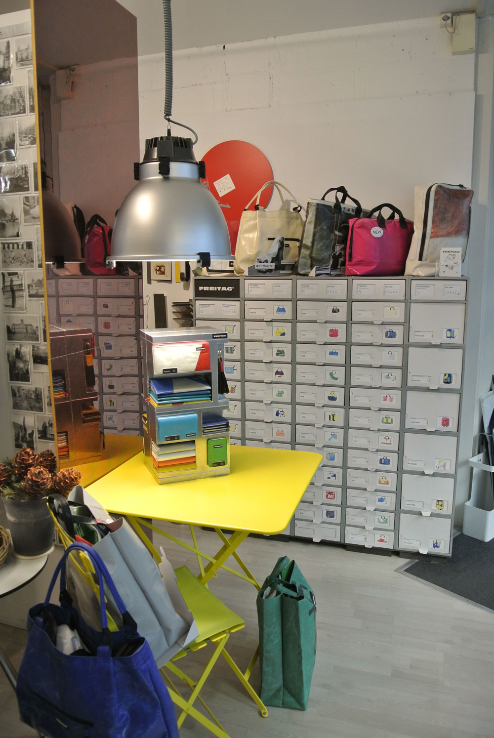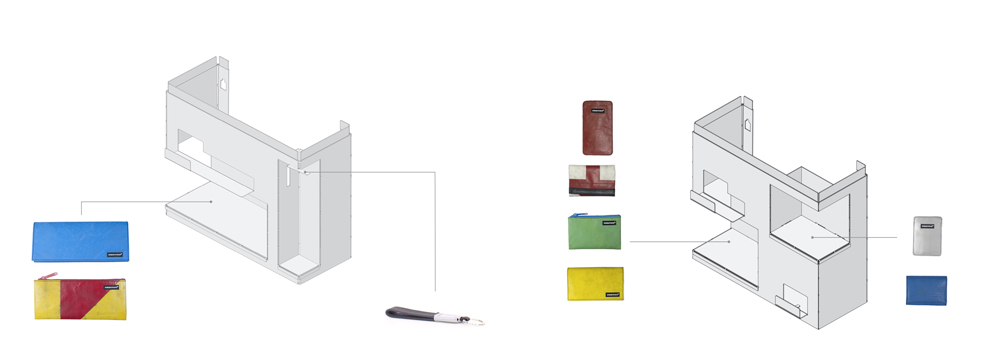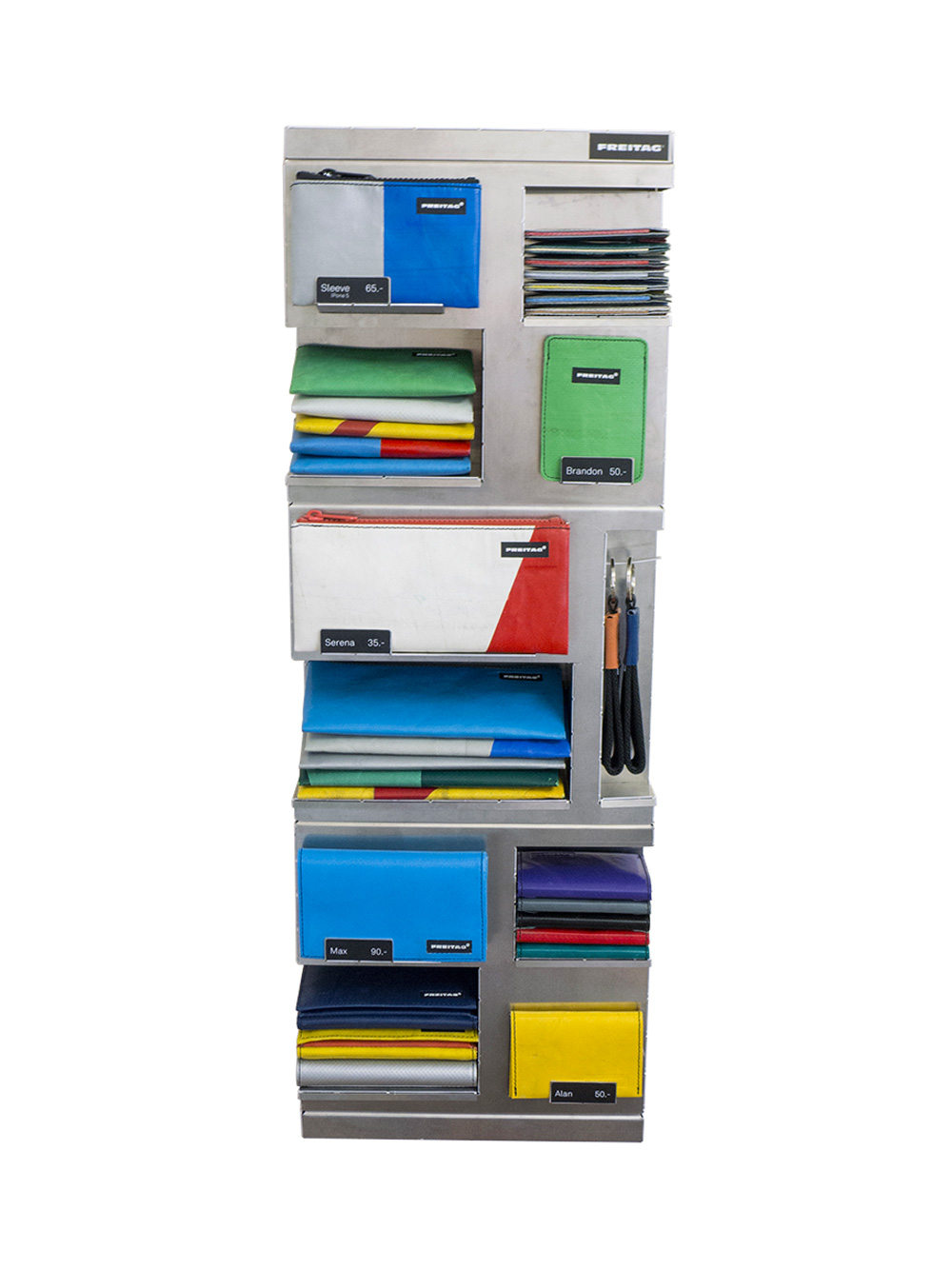 Der Warenträger Level ist der Übervater aller FREITAG Kleinteile. Als Verkaufsdisplay von Max, Caroline, Alan und co. fügt sich in jedem FREITAG-Store oder beim Reseller als Wandmontage oder Aufsteller ins Shop Bild ein.